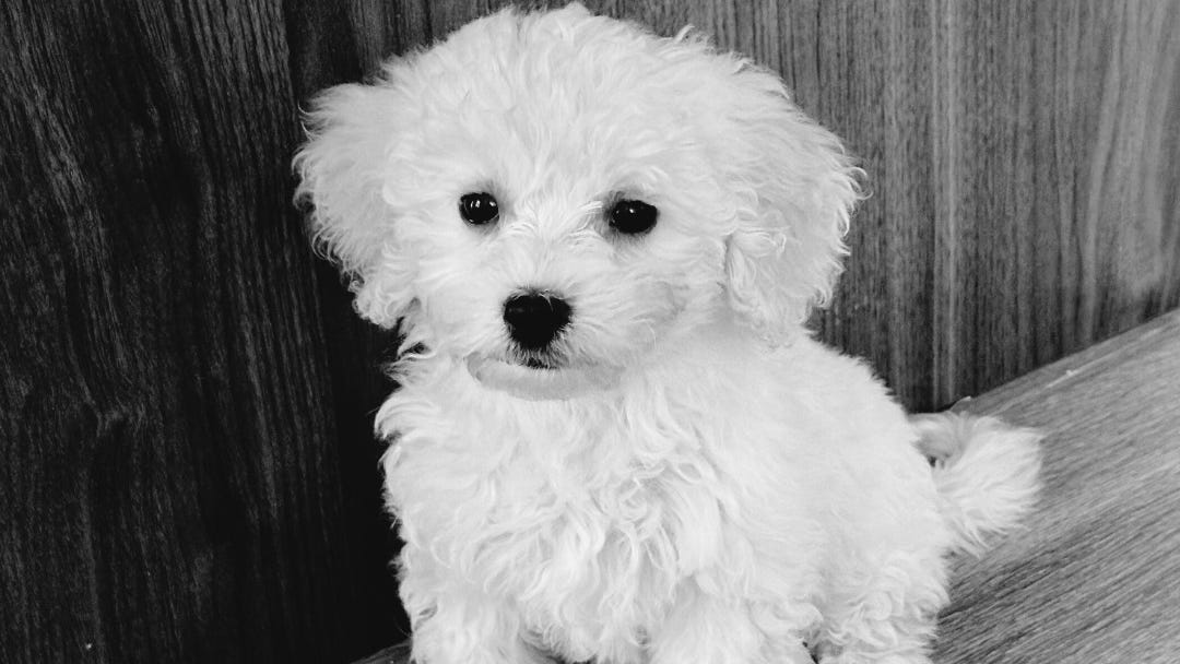 Her name is Bear. She’s a Bichpoo with curly, white fur and dark eyes. She looks exactly like a teddy bear.